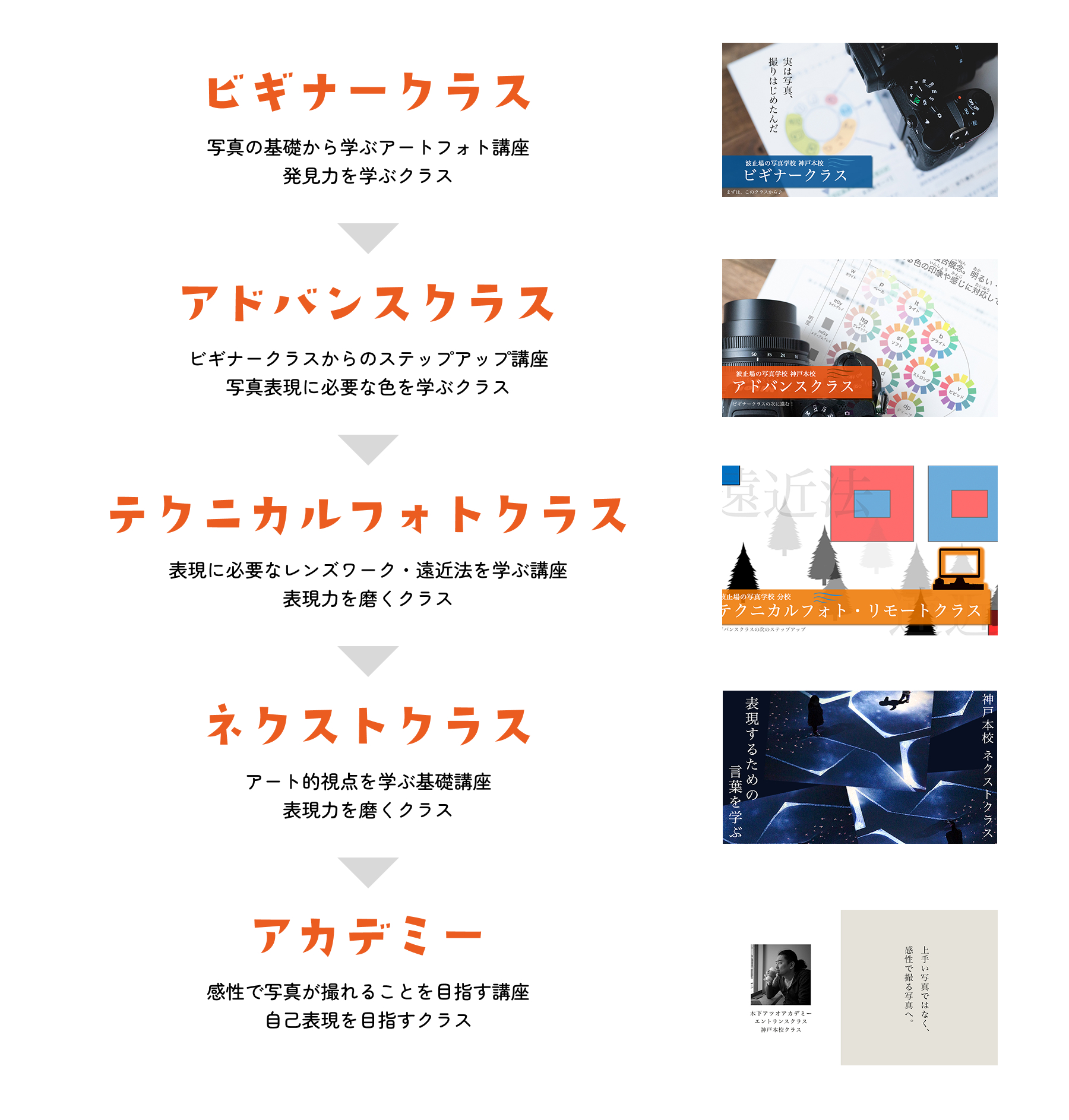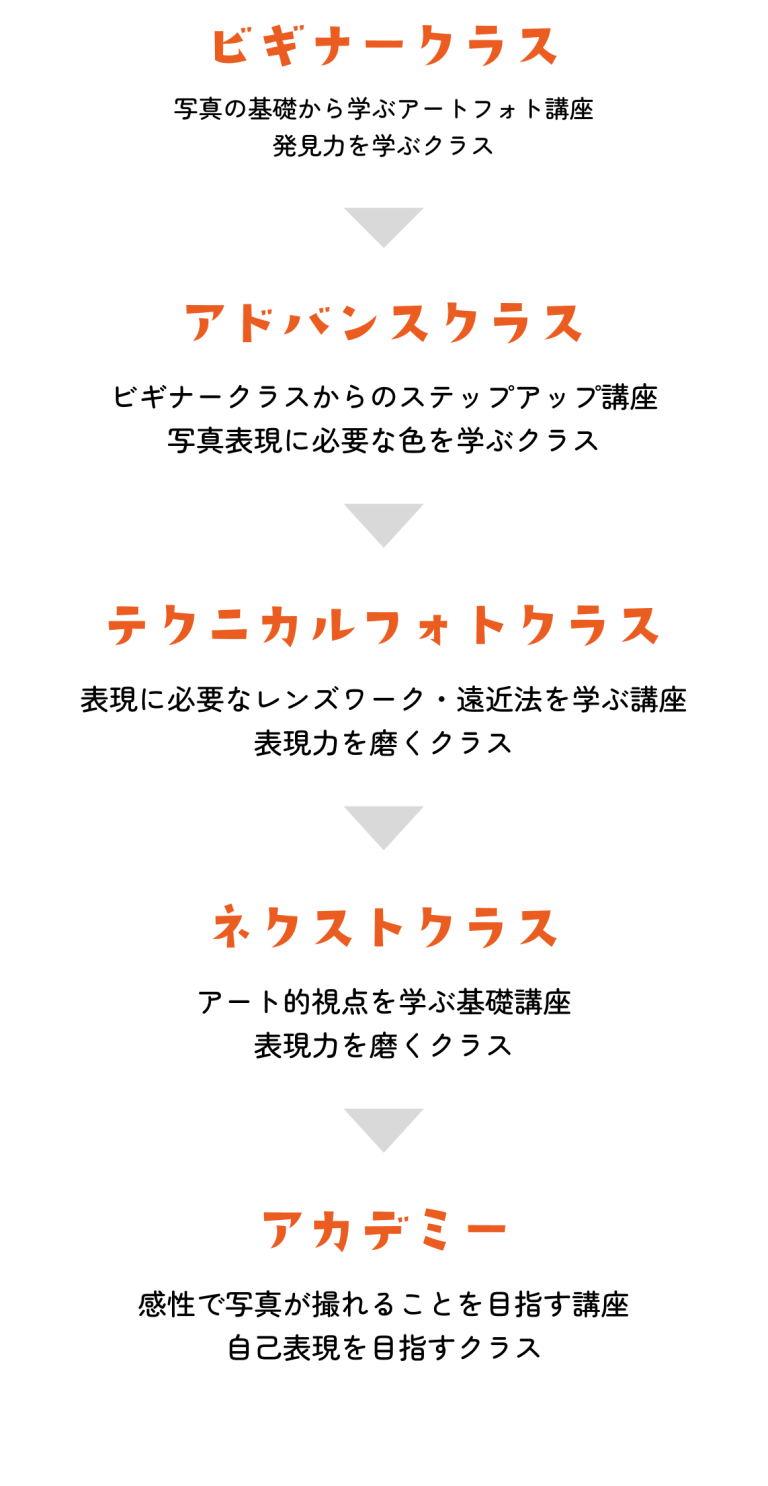 完全初心者向けの一日講座から、ポートレートや照明ライティング、額装講座など専門的な内容まで。継続的に学べるスクーリング講座・クラス制講座から、半日開催のワークショップまで、自分のペースで選べます。