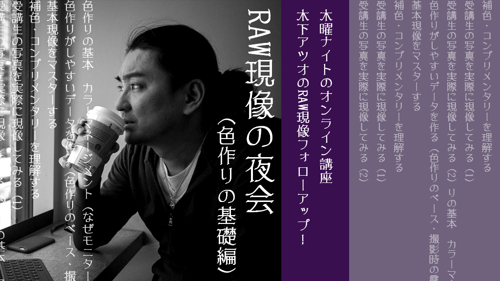 【分校・会員】木曜ナイトのオンライン講座〜木下アツオのRAW現像フォローアップ!RAW現像の夜会(色作りの基礎編)