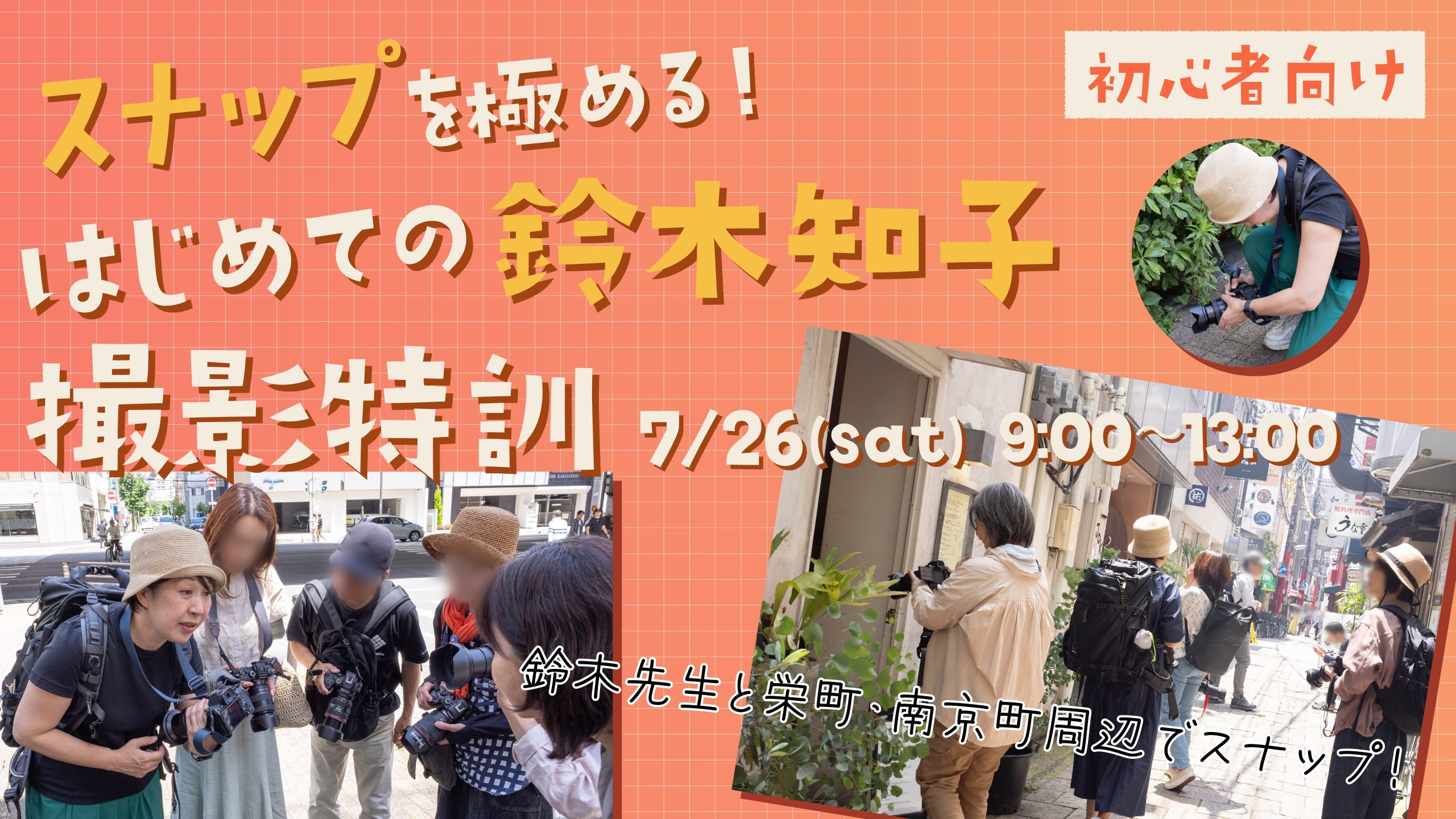 7月26日(土)、波止場の写真学校 横浜本校 校長の鈴木知子先生を神戸にお迎えし、毎年恒例「スナップを極める!はじめての鈴木知子撮影特訓(初心者向け)」を開催します!
