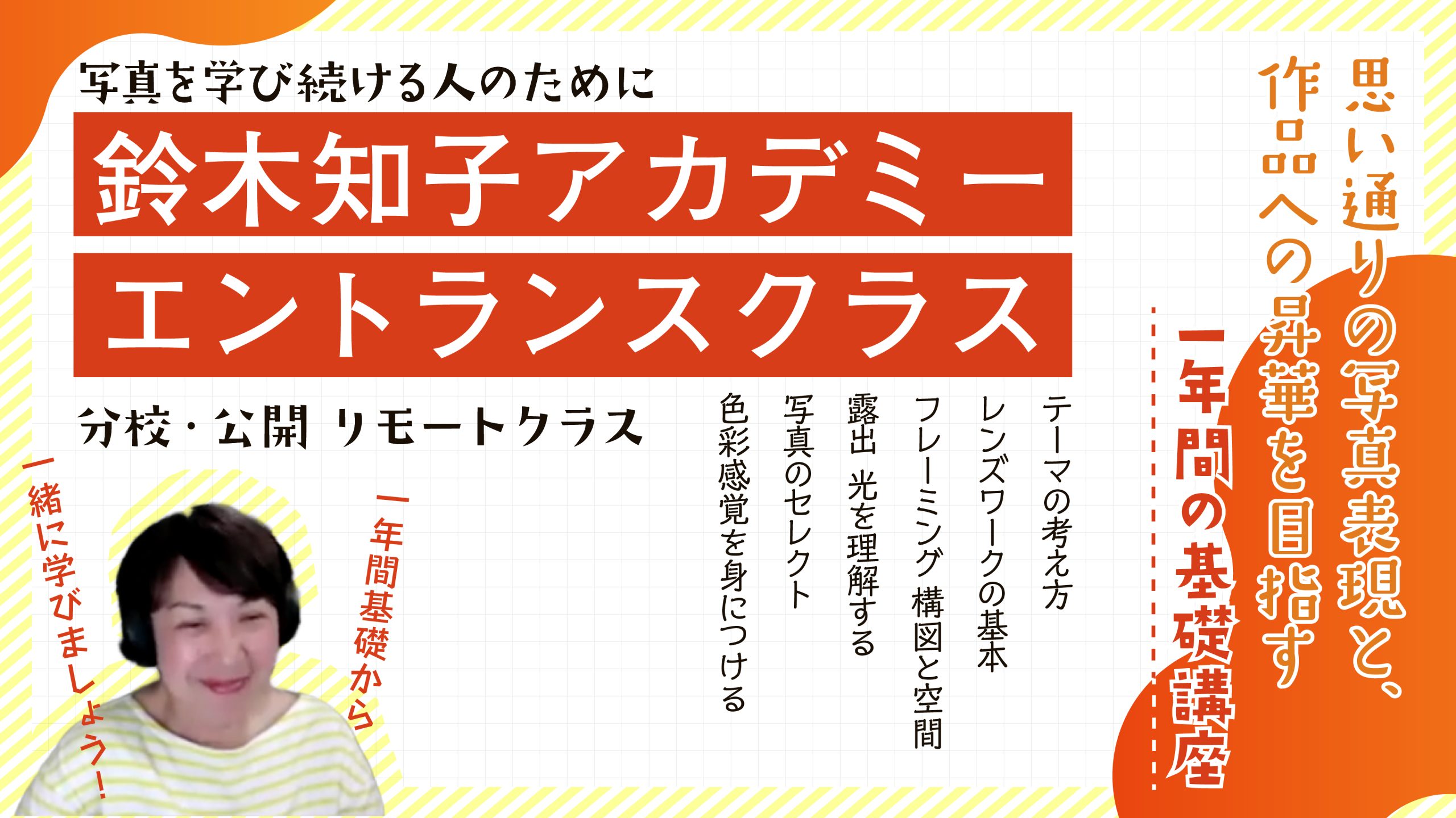 スナップ写真を得意とする写真家 鈴木知子先生より、思い通りの写真表現を実現するためのメソッドを一年間かけて深く学べる講座です。